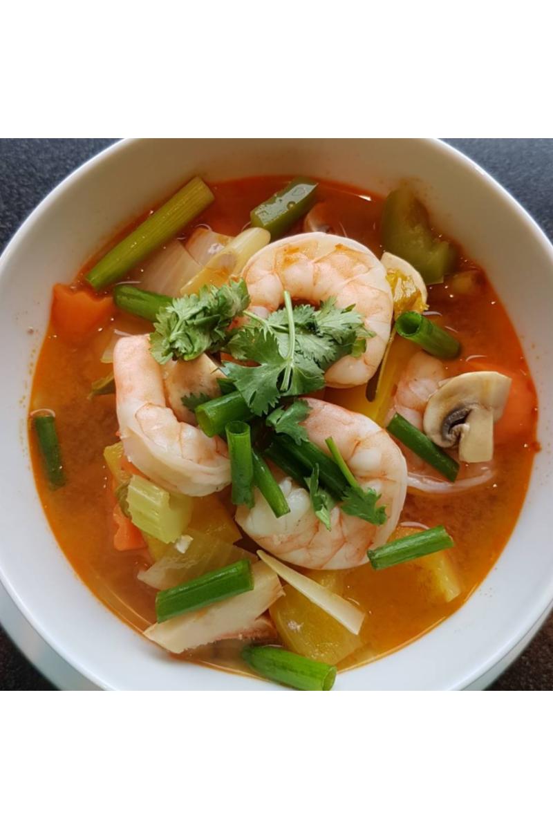 Suppe med sitronsaft, kjøtt, sitrongress, limeblad, galangal og grønnsaker. Severes med ris.