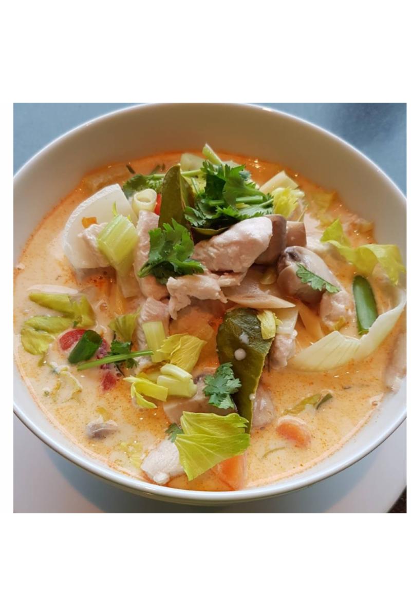 Suppe med kokosmelk, sitronsaft, kjøtt, sitronblad, sitrongress, galangal og grønnsaker. Severes med ris.