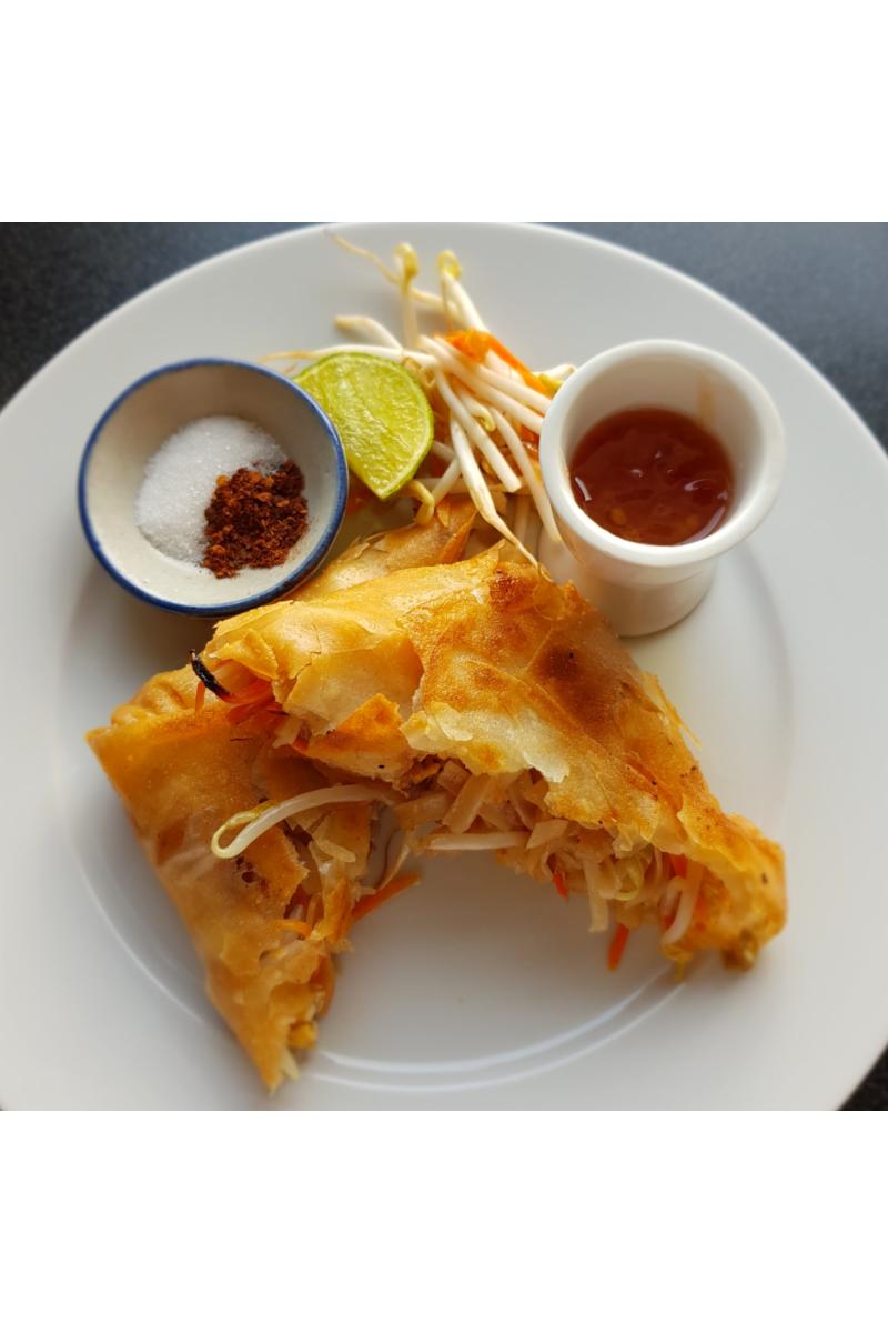 Innbakt stekte risnudler i tamarind saus med kjøtt, egg og grønnsaker. Severes med peanøtt, lime, chili og sukker.