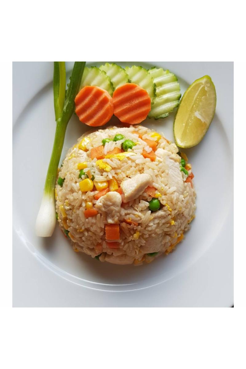 Stekt ris med egg, kjøtt, soya og grønnsaker. Severes med lime og agurk.