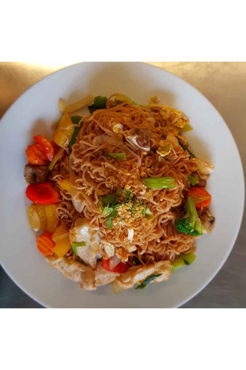 Stekte eggenudler med egg, kjøtt, soya, østerssaus, krydder og grønnsaker.