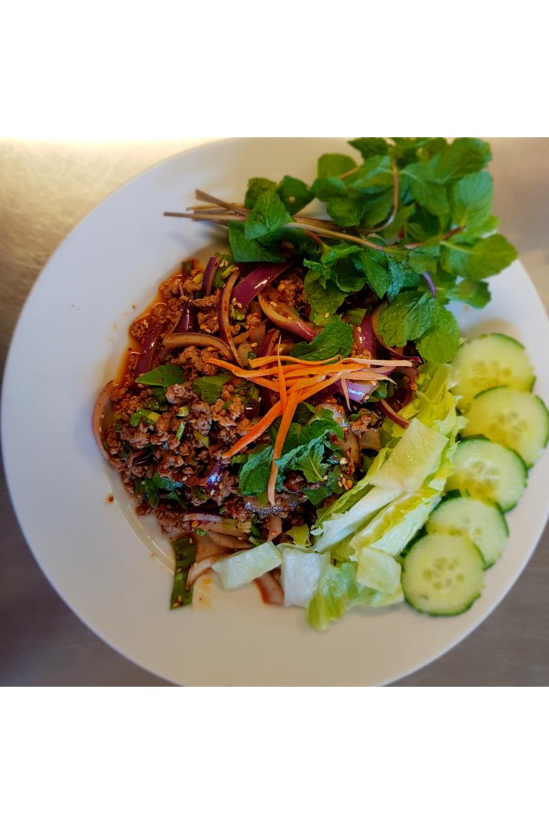 Revet And blandet med lime, fiskesaus, chili, løk, peppermynte og grønnsaker. Serveres med ris, peanøtt, salat og agurk.