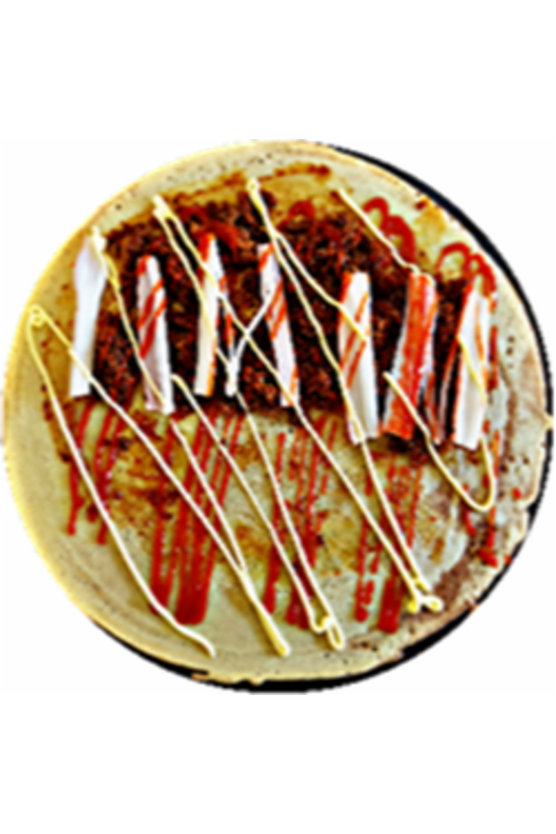 Tørket svinekjøtt, crabstick, ketchup, majones og chillisaus