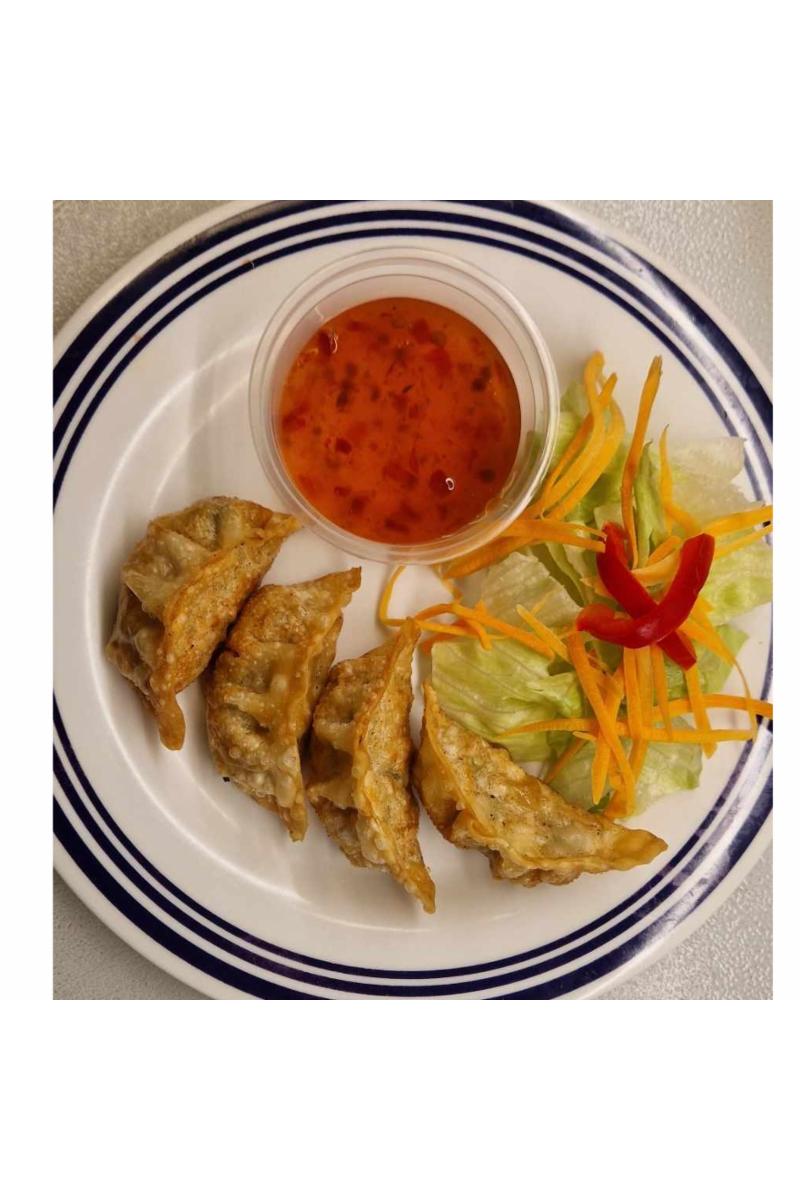 4 stk. Gyoza kylling med salat, ris, sweet chilisaus og soya.